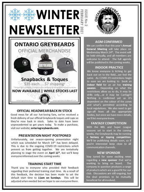 Hopefully you have all had chance to check out the team’s new social media accounts on Twitter (@ONGreybeards), Instagram (@ontariogreybeards), and the existing Facebook group (Ontario Greybeards Masters Rugby League). We also have a shiny new website which is the official home of all things Greybeard (ontariogreybeards.com). Please like, follow, share, visit these accounts as this helps advertise our team and will assist in bringing in new players, opponents, and sponsors.