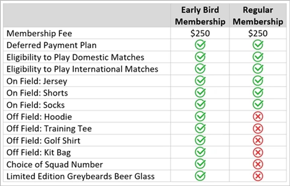 Early bird membership is the best value with on field and off field kit included at no additional cost. Off field kit includes Hoodie, Training Tee, Golf Shirt, Kit Bag, and Limited Edition Beer Glass......all gloriously branded with the Greybeards logo.