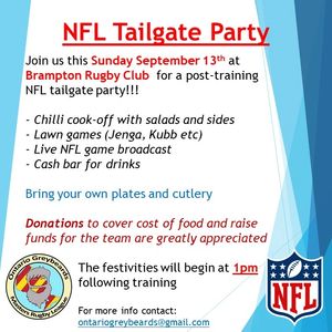 Sunday September 13th we will be hosting a tailgate party to celebrate the start of the NFL season. Training will begin at Brampton Rugby Club at 12pm sharp before putting down the ball and picking up a beer (or non-alcoholic beverage for those who are driving).